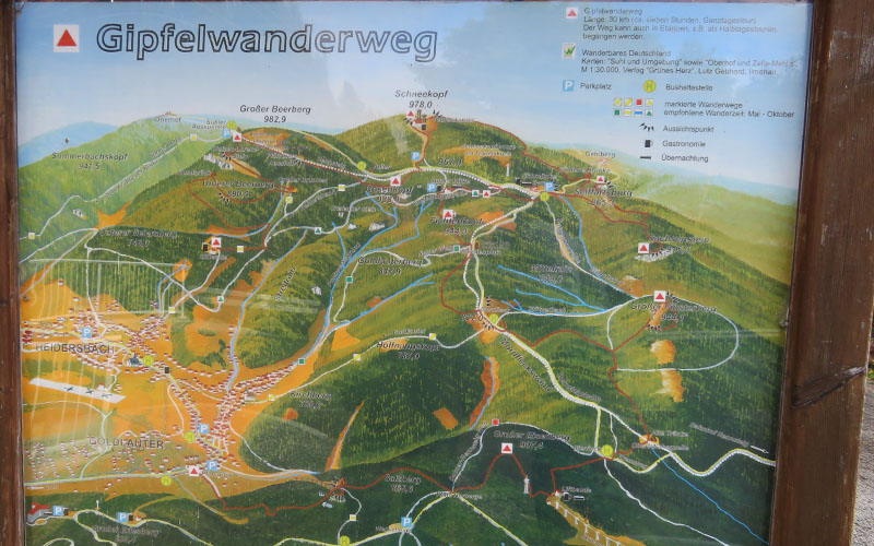 Streckenführung: Parkplatz Pfannrain (Suhl OT Goldlauter) > Salzberggipfel (867m) > Großer Eisenberg > Großer Finsterberg (944m, Aussichtsturm gesperrt (wird 2019 restauriert)) > Mordfleckwiese > Fichtenkopf (944m) > Suhler Hütte ( 924m (höchstgelegene Hütte Thüringen; Montag geschlossen) > Schmücke Gasthof > Sachsenstein (924m) > Seiffartsburg (alte Burgruine) > Güldene Brücke > Teufelskanzel > Schneekopf (978m, Gasthof vorhanden) > Rosenkopf > auf Rennsteig > Plänckers Aussicht > Großer Beerberg (983m) > Wegekreuzung (links abbiegen um weiter auf Gipfelwanderweg zu bleiben oder von hier nach Zella Mehlis oder weiter auf dem Rennsteig Richtung Oberhof zu gelangen) > Unterer Beerberg > Unterer Geiersberg (Skibaude, Ende des Gipfelwanderweges) > Suhl Ortsteil Heidersbach (laufe weiter bis Goldlauter wo dein Auto steht oder nimm den Bus)